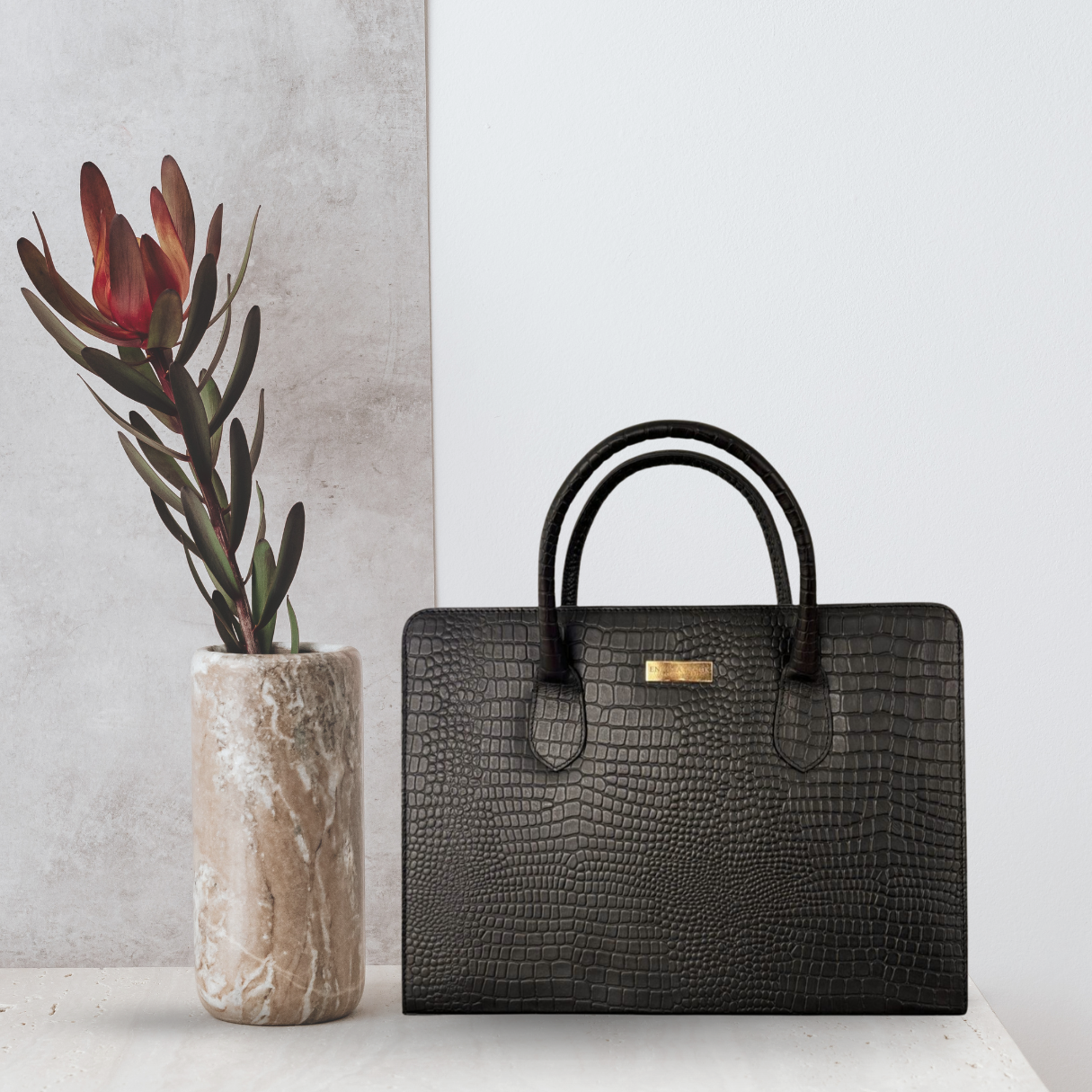 Indulge in luxury and sophistication with the Vantara Tote. Crafted with a croc leather print, this stylish work bag fits your 15" laptop and offers highly organized interiors for all your essentials. The versatile design allows it to be worn as a cross body or handbag, while the zipper closure, key chain, and card holder add functional elegance. Elevate your everyday with the Vantara Tote.